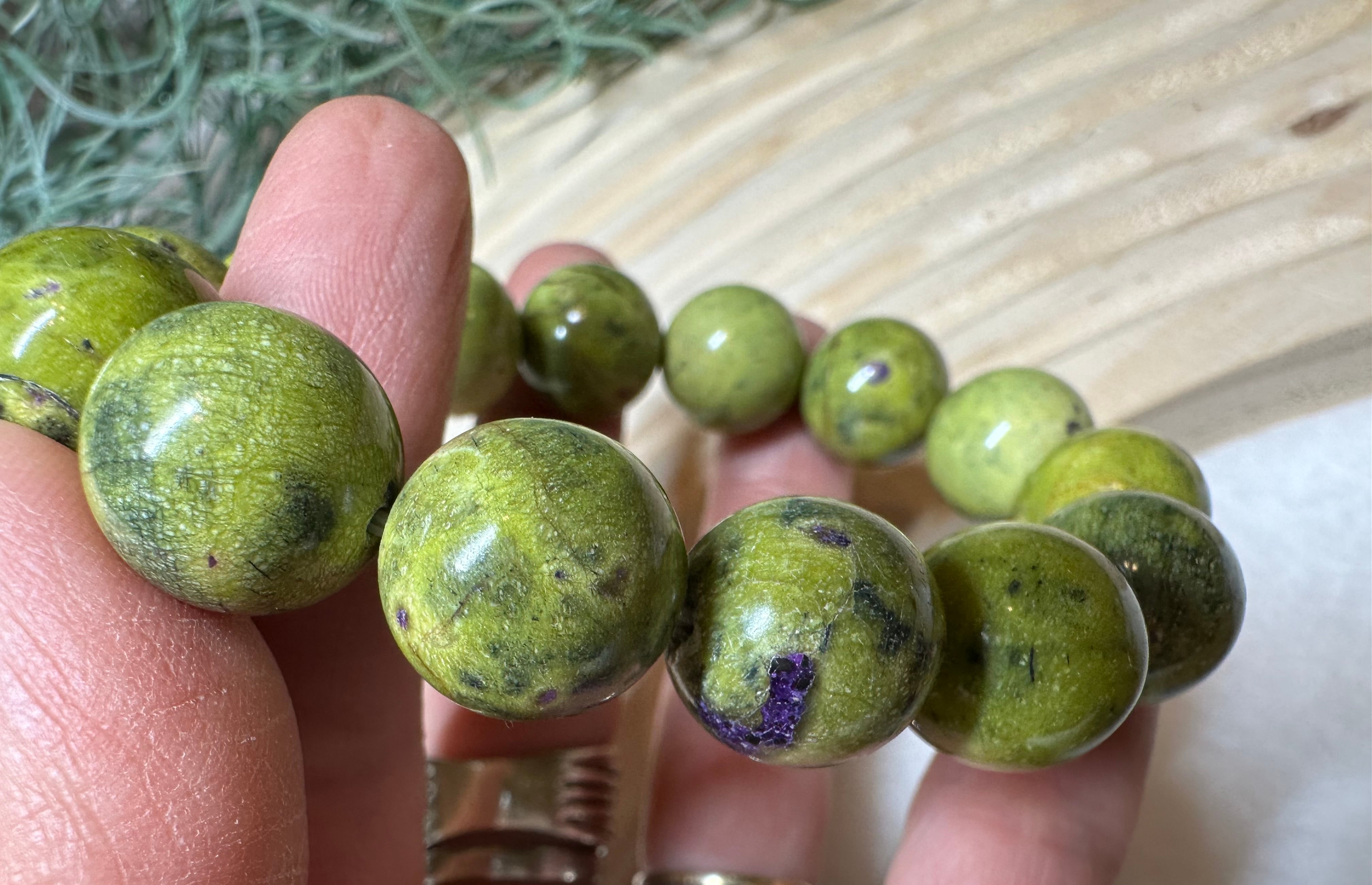 グリーンのサーペンティンをベースに紫のスティヒタイトがところどころ混じりあう石。